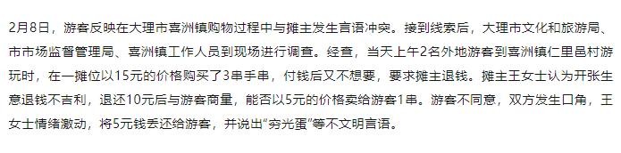 根据通报称,此事发生在2月8日上午大理市喜洲镇,事情闹大后大理文旅局和市监局就找上了商贩王大娘进行调查。