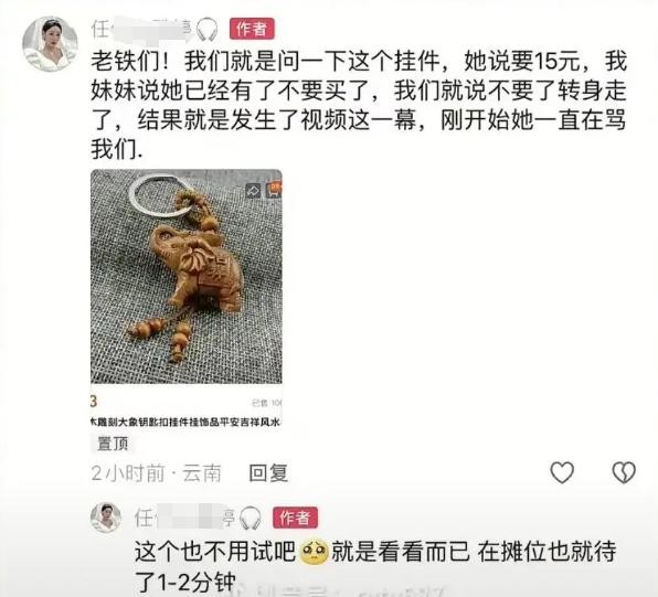 视频被任女士发布上网后,立刻引来不少网友关注,她在评论区说自己当时看中了一款小象挂件,卖15元,但她妹妹已经有了,所以就不要了,结果却被大娘追着骂。