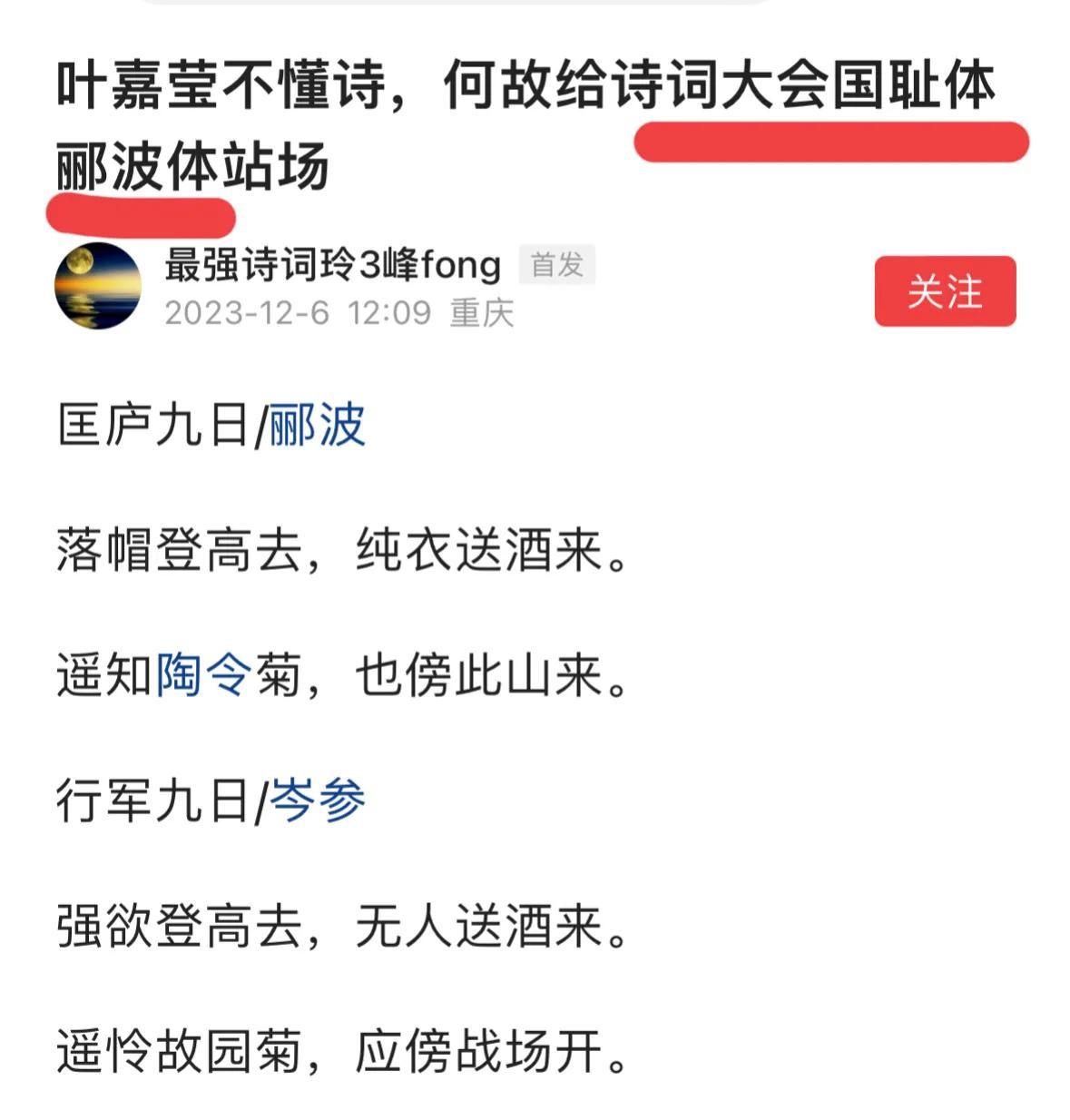 郦波再次出现在头条新闻,竟然是以“国耻体”标题出现的!一位叫“最强诗词玲3峰”的网友发文《叶嘉莹不懂诗词,何故给诗词大会国耻体郦波体站场》,活生生把郦波诗词放在“国耻体”考量!
