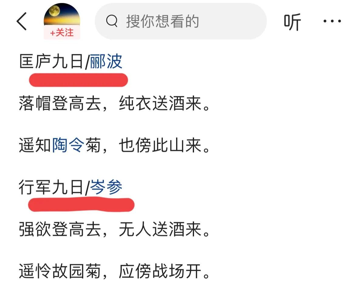 郦波的诗题《匡庐九日》点名了地点是庐山,所以不存在“遥知”的地理与空间概念,这是一种刻意、死板的模仿与生搬硬套!岑参写“遥怜”那是因为行军途中,所以地理与空间位置都是合情合理的。这就是郦波这一句诗理不通的原因。