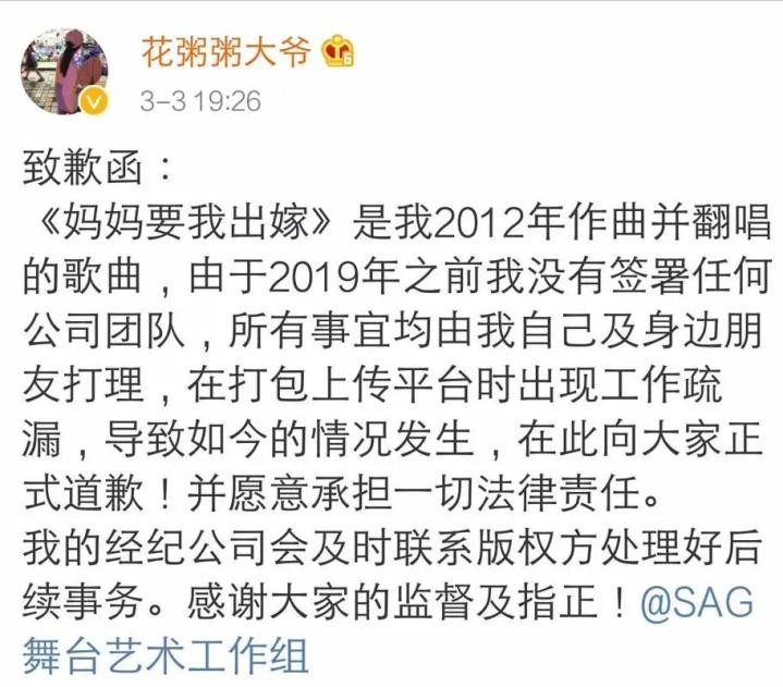 没办法的她只能继续道歉,虽然道歉了,也把相关歌曲给下架了,但这时候花粥的声誉已经受到了很大的影响。