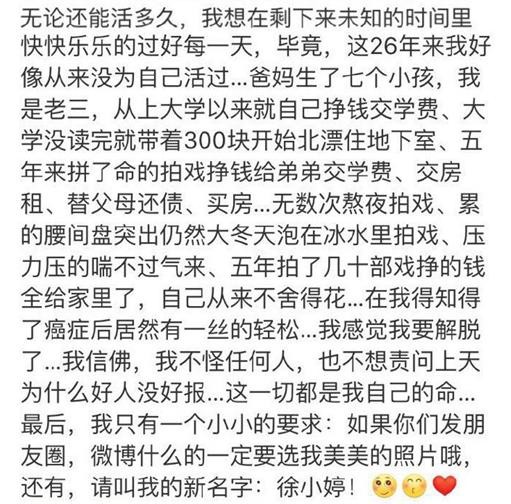 徐婷在微博里公开了自己的病情,并自述道:26年来我好像没为自己活过,爸妈生了七个孩子,她是老三,从大学以来就自己挣钱交学费,大学没读完就带着300块开始北漂住地下室,五年来拼命拍戏挣钱给弟弟交学费,交房租,替父母还债买房,无数次熬夜拍戏,压的喘不过气,五年拍了几十部戏的钱全给家里,自己从来舍不得花,得知自己癌症后居然有一丝轻松,感觉要解脱了。