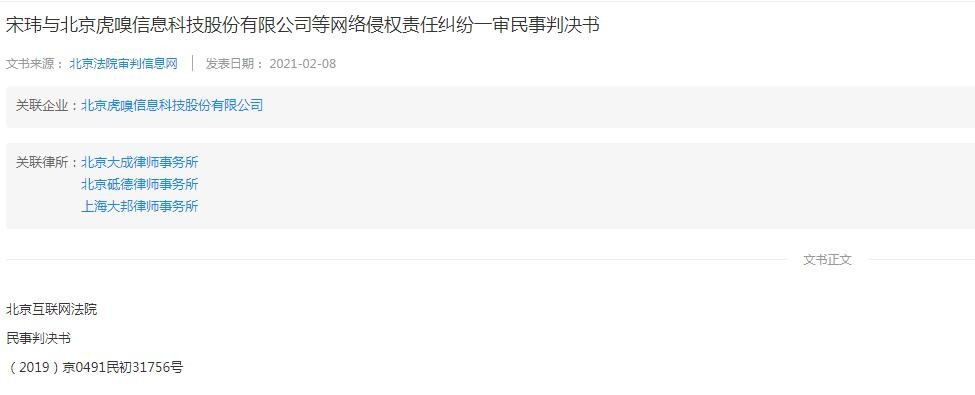 近日,据企查查披露的判决书显示。原告宋x诉被告周x、北京虎嗅信息科技股份有限公司侵害名誉权纠纷一案,北京互联网法院于2019年9月3日立案后,依法适用普通程序,公开开庭进行了审理。该案现已审理终结。
