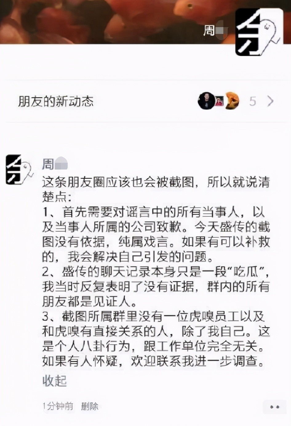 (3)截图所属群里没有一位虎嗅员工以及和虎嗅有直接关系的人,除了我自己。这是个人八卦行为,跟工作单位完全无关。如果有人怀疑,欢迎联系我进一步调查。”被告认可发布谣言的事实,主张其发布的言论没有依据,仅仅属于小范围内的推论揣测,并无大肆散布侵权内容,且已经在朋友圈进行了事实澄清和道歉,已经积极进行补救,防止负面舆情扩大。原告和被告虎嗅公司亦提交了上述截图。