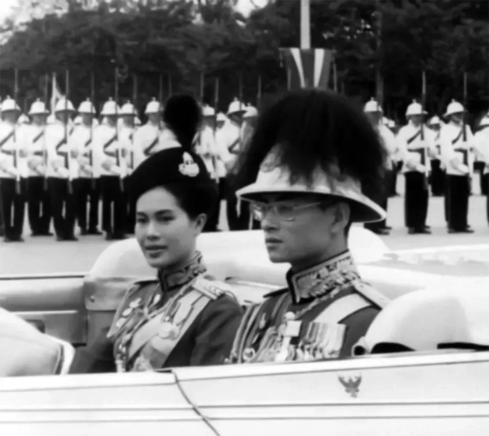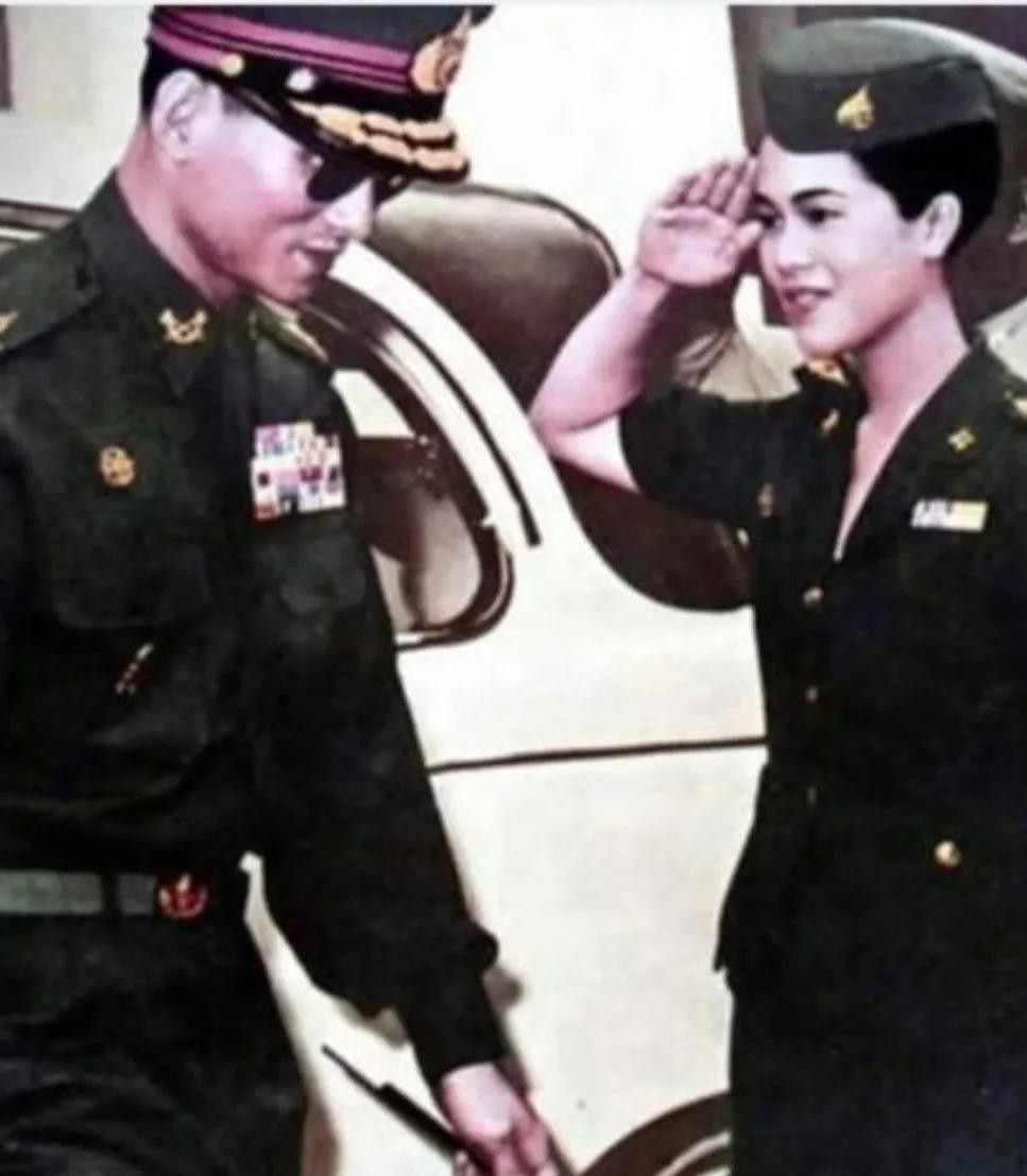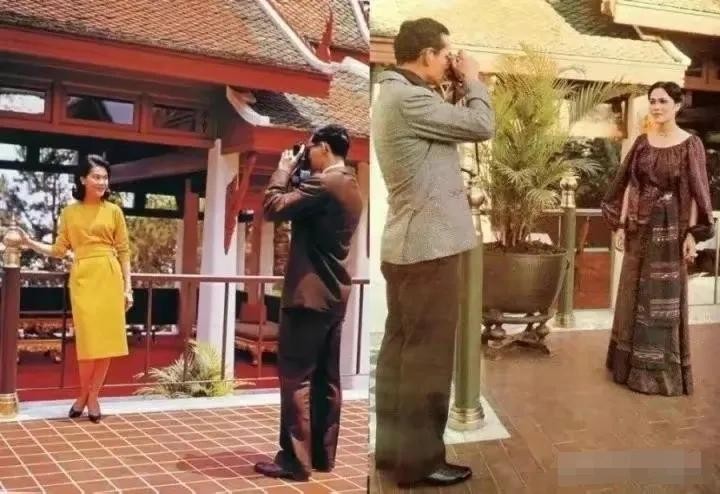 她与普密蓬的合影,一个抬手军礼,绿色修身的戎装,修长的脖颈,俏丽的容颜。普密蓬唇边的那一抹笑意,就是他们幸福婚姻的写照。
