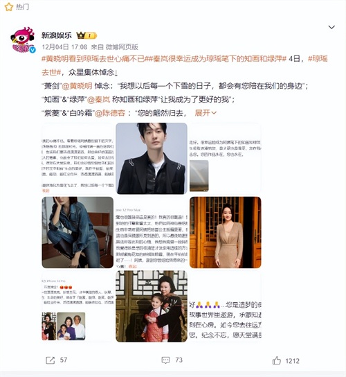 #黄晓明看到琼瑶去世心痛不已##秦岚很幸运成为琼瑶笔下的知画和绿萍# 4日,#琼瑶去世#,众星集体悼念↓