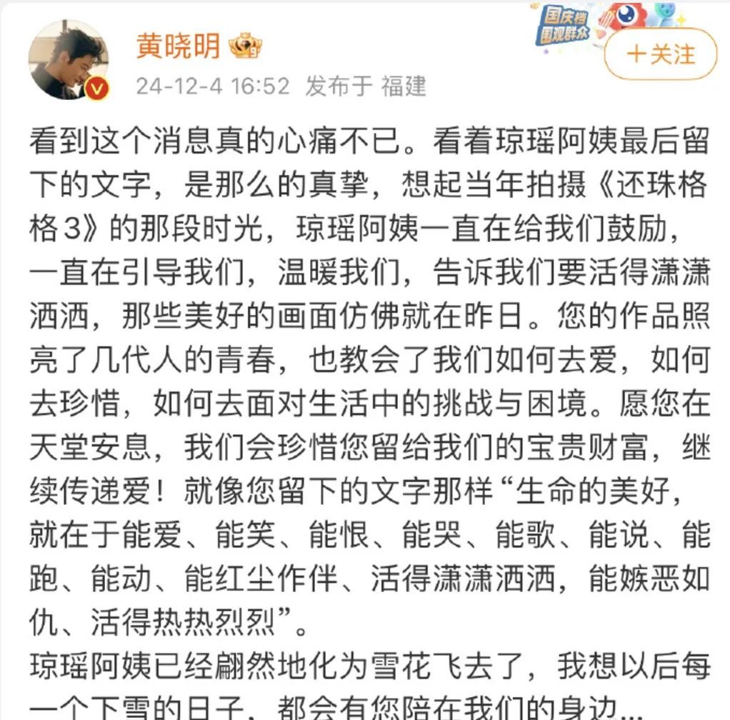 黄晓明与其他明星简短的告别不同,他的文字洋溢着真挚的情感和深刻的思考,作为琼瑶作品中崭露头角的演员之一。