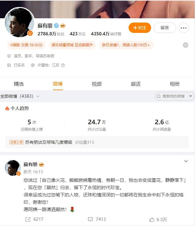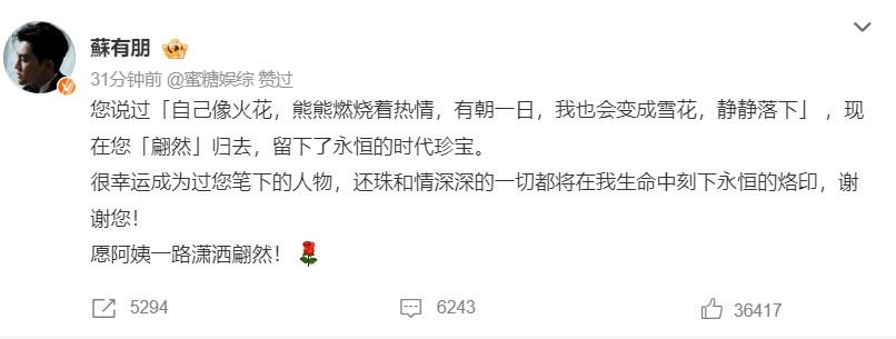 琼瑶的离去后,她的精神,她的文字,她对爱情和生命的理解,依然在影响着她身边的晚辈们,比如苏有朋等人。
