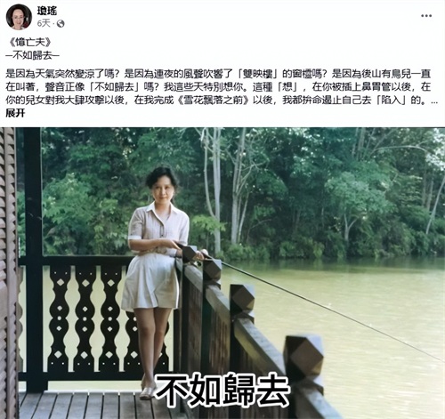 琼瑶还曾接连两次发布已故丈夫平鑫涛的遗照,配以"不如归去"的文字,这简单的四个字,却道尽了她对生命和爱情的深刻感悟,她似乎在暗示,她已经准备好了与挚爱重逢的心情。
