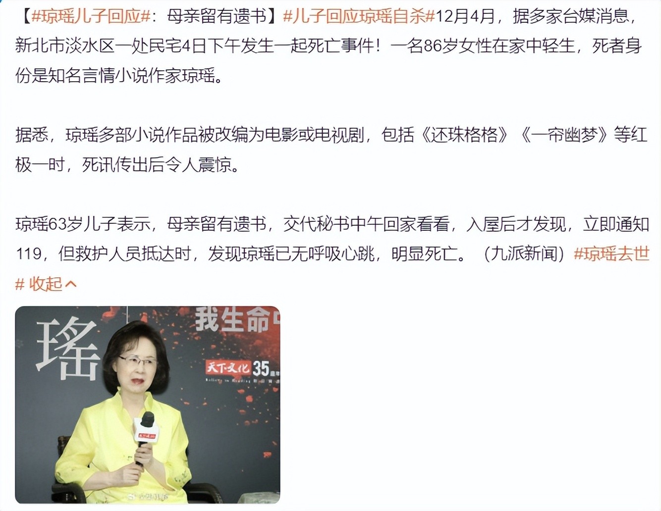 86岁琼瑶2个轻生原因曝光!苏有朋、黄晓明、范冰冰发文悼念