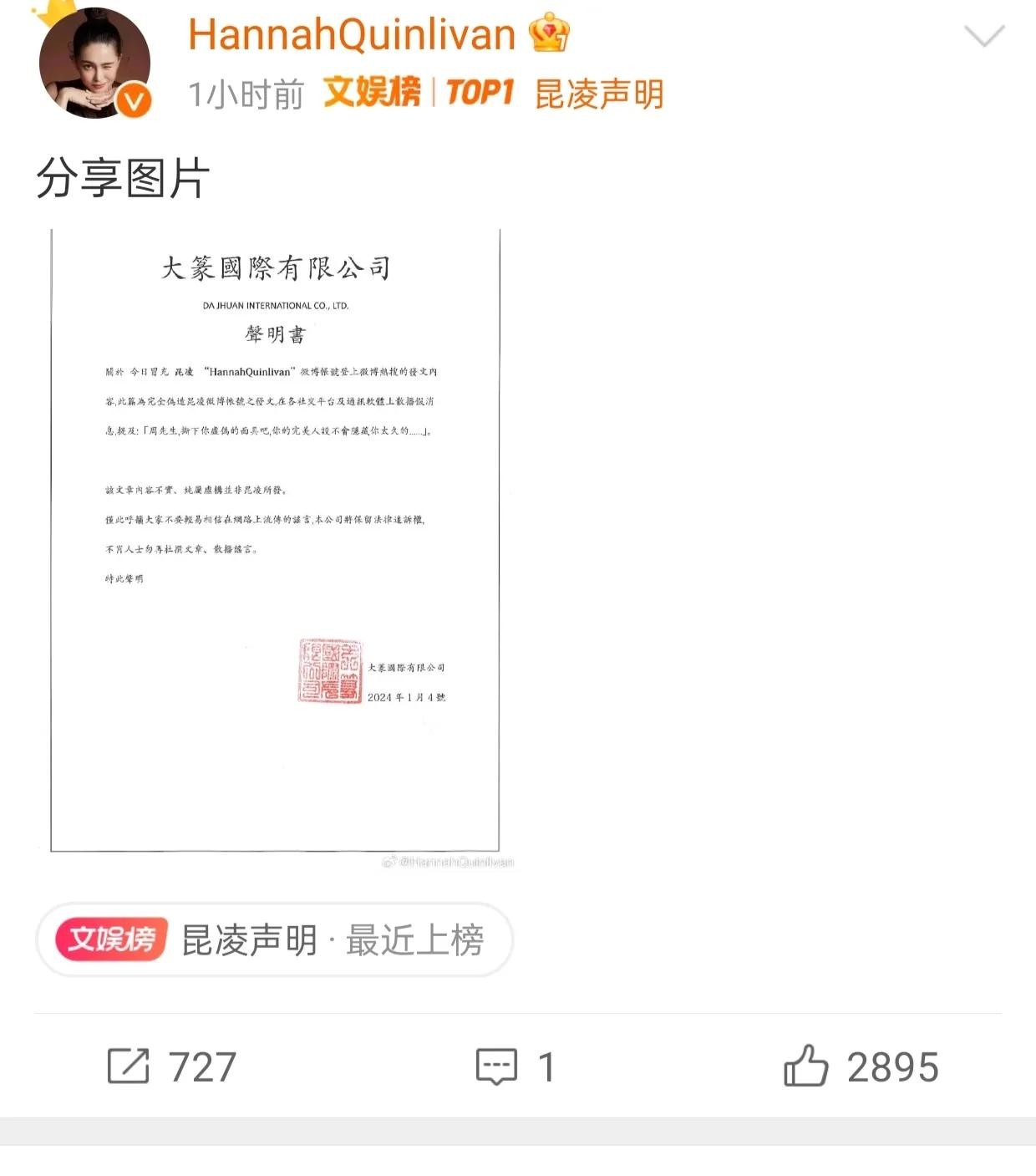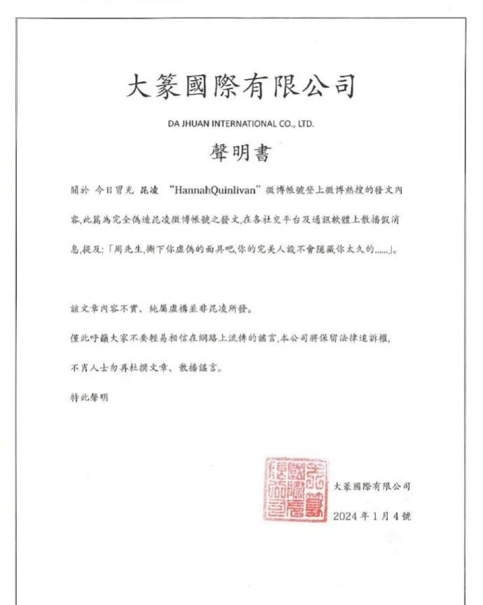 网上闹的这么大,也惊动了在英国度假的昆凌和周杰伦,因为周杰伦没有微博号,所以就是昆凌出来发声明回应。