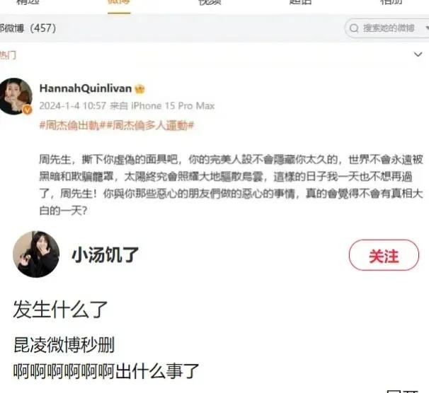 1月4日,昆凌和周杰伦的名字在热搜上挂了一下午,只因为一张疑似昆凌发文怒斥周杰伦出轨,和朋友干了很多恶心事儿,受不了要和周杰伦离婚的截图,这张截图上的确是昆凌的微博号,但点进昆凌的微博里却没看到这条内容,于是被不少网友贴上,昆凌发文怒斥周杰伦后秒删的标签。