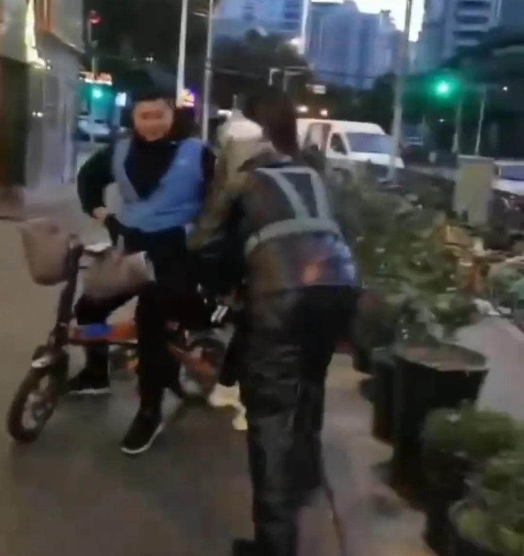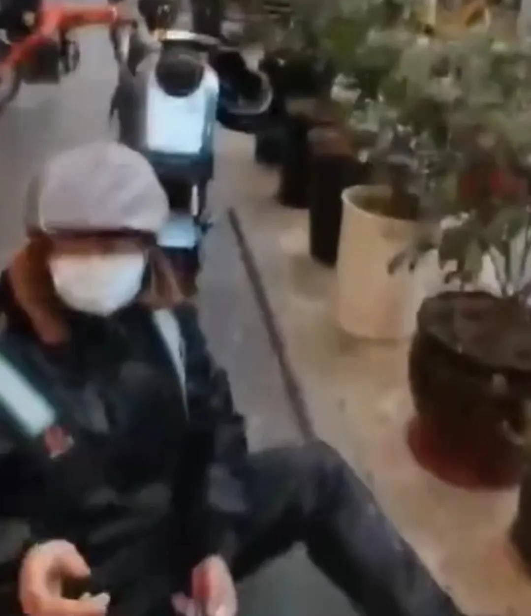 当宋某再次踢打姜某时,一戴黄色头盔的男子,终于过去拦了一下她。他阻止了一段时间,并阻止其他代驾小哥的挑衅话语。