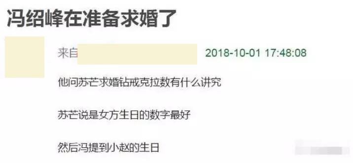十月份有网友爆料冯绍峰将在赵丽颖生日那天向赵丽颖求婚,并且向苏芒询问求婚钻戒克拉数有什么要求,苏芒表示女生生日的数字最好,冯绍峰说了赵丽颖生日