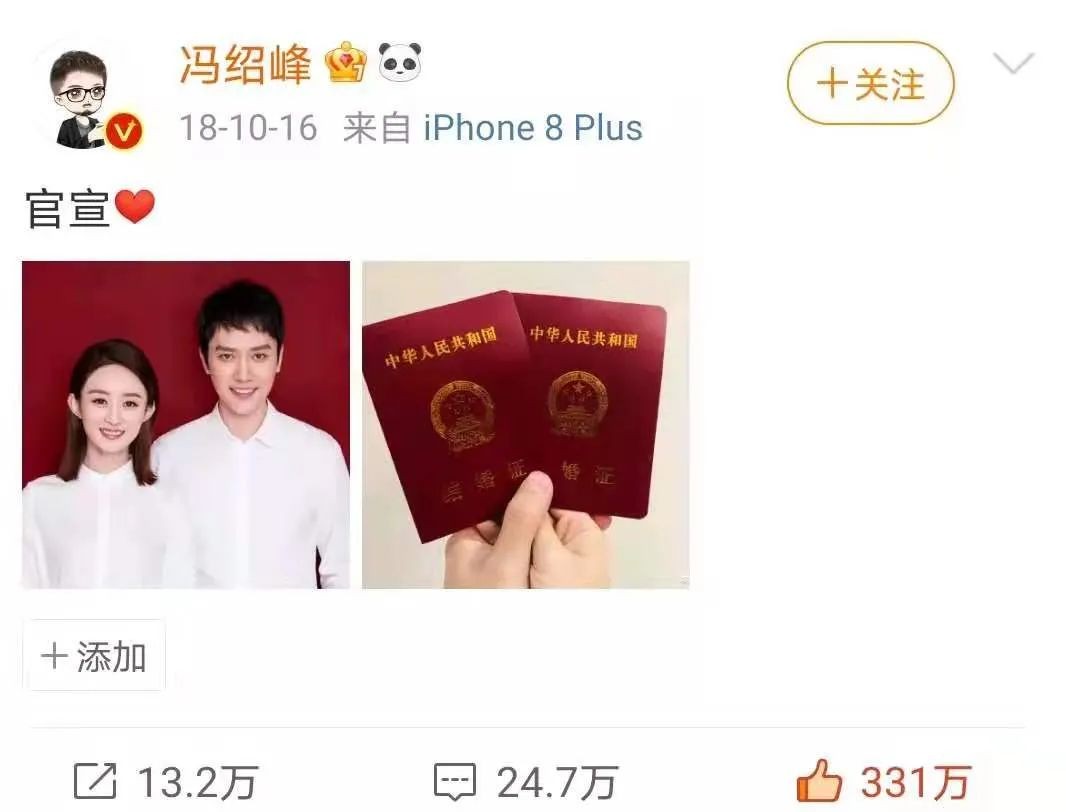 据说领证日期是冯绍峰定的,他决定给颖宝一个惊喜,特地选在了女方生日当天公布。