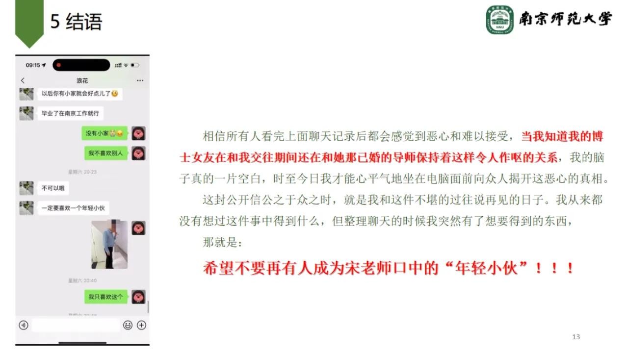 网友对发布公开信的缘由表示,他并不是希望得到什么补偿,而是希望不要有人再成为导师口中的“年轻小伙”。因为根据聊天截图,宋某某让其女友毕业后在南京工作,安个小家,找个“年轻小伙”。