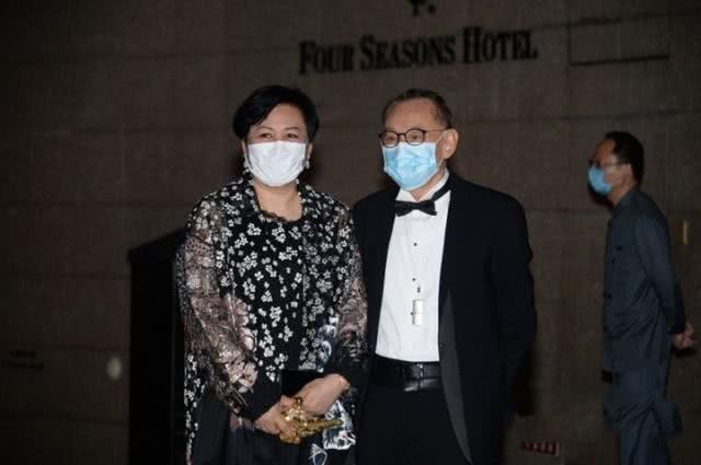 杨受成和太太一起入场,杨受成穿着一套黑色的西装,杨太太穿着一件黑白搭配的碎花上衣,夫妻俩很有cp感。