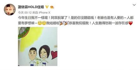 现在都不怎么关注微博了,新闻也没看到谢依霖结婚的新闻,我们hold住姐居然在3月19号突然宣布结婚,我居然浑然不知,如此低调,不像我认识的那个搞怪谢依霖的性格啊!