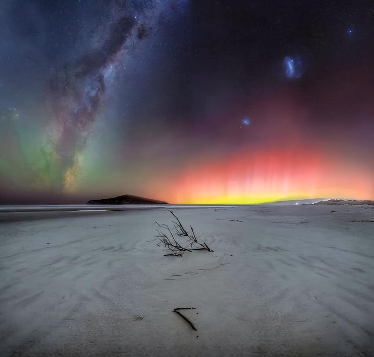 新西兰泰阿里海滩上空的银河和极光。由于太阳粒子与地球大气中的不同气体相互作用,这种极光呈现出鲑鱼粉色和黄色带。