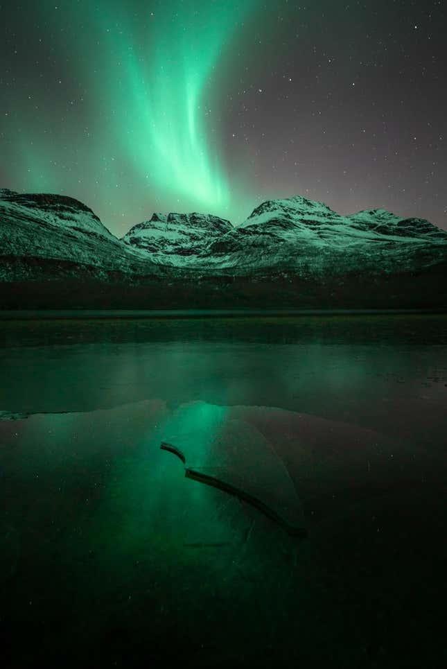 在这张图片中,极光线被地面上的雪条纹反射出来。两者之间是挪威罗弗敦群岛的一座高耸的山峰,那里有很多人可以找到观察宇宙光的好地方。
