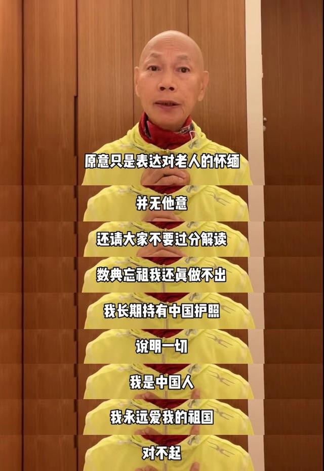 他在视频中言辞恳切地表示自己是中国香港演员罗家英,对于此前未经深思熟虑后的哀悼之词表示抱歉。他辩解称愿意只是表达对老人的缅怀并无他意,恳求大家不要过分解读。