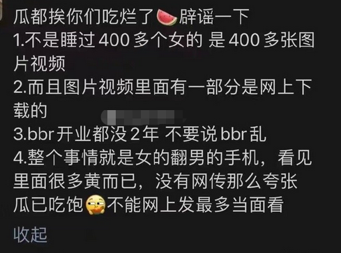 作为网传事件的酒吧也作出了回应,该事件纯属于个人生活行为,其实和柳州bbr酒吧并没有关系,所以吃瓜还是需要理性一点的,不信谣不传谣不造谣。
