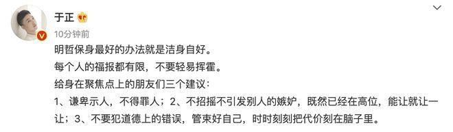 网易娱乐 9 月 11 日报道 11 日早,于正发文:" 明哲保身最好的办法就是洁身自好。每个人的福报都有限,不要轻易挥霍。" 他还给身在聚焦点上的朋友们三个建议:"1、谦卑示人,不得罪人;2、不招摇不引发别人的嫉妒,既然已经在高位,能让就让一让;3、不要犯道德上的错误,管束好自己,时时刻刻把代价刻在脑子里。"