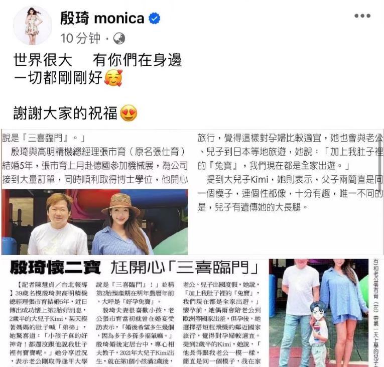 去年年底,殷琦怀上了二胎,发文感谢大家的祝福 ~