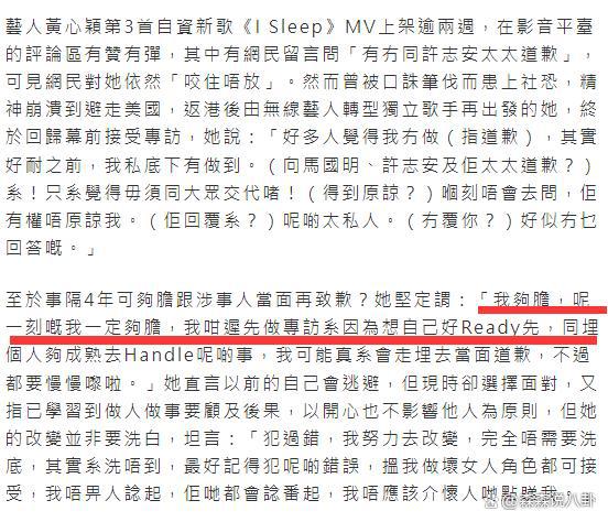 记者追问 " 现在是否有胆量向当事人道歉?" 黄心颖坚定回应:" 我够胆,这一刻我肯定够胆,我那么迟才做采访是因为想让自己准备好,等自己够成熟去处理此事,我可能真的会走去当面道歉,不过都要慢慢来的。"