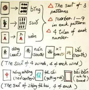 下面介绍最简单的推倒胡(学会推倒胡,再学别的麻将也容易一些)。开始玩,码牌抓牌都不用你管(别人或机器帮),你将看到给你的13张牌。现在介绍全部的牌,包括你的,别人的(加你一共4人),和桌上扣着的,和明放着的。数字牌:1~9条,1~9万,1~9饼,各4张,共3×9×4=108张;字牌:东南西北中发白,各4张,共7×4=28张;还有8张花牌,所以总共有108+28+8=144张牌。接着讲:看着你的13张牌,依次每人拿回一张牌再扔掉一张牌(如拿回的是花牌,把它明放在桌上,再拿回一张牌),这样一次一次的换牌,直到有人宣布他赢了,并把他的14张牌(他自己的13张和最后拿回来的一张或别人扔掉的一张)明放在桌上,俗称他胡牌了。这把牌结朿,然后再重复来一把。下面讲什么样的14张牌算赢了。这14张牌要能够分成5组,前4组每组3张牌,最后一组2张牌;而且要求最后一组2张牌是相同的(俗称对子),如2张都是2饼,或2张都是“东";而且还要求前4组每组都是顺子或刻子。下面讲什么是顺子和刻子:先讲刻子,一组3张牌都是相同的叫刻子,如3张9条叫一个刻子,如3张"发"也叫一个刻子;再讲顺子,一组3张牌都是条(或都是万或都是饼)且是连在一起的3个数叫顺子,如3条4条5条组成一个顺子,如7万8万9万也组成一个顺子。再讲两个重要的做刻子和顺子的方法:"碰"与"吃":碰,当你的13张牌中有2张相同的牌,如2张"西"时,这时要注意别人扔出的每一张牌,当别人扔出"西"时,立刻喊"碰"(如在机器上打牌,则在你的牌前会出现"碰"的小图标,立刻单击它),并将你的2张"西"和别人扔出的一张“西"明放在你的牌的前面,再扔出一张牌,"碰"结束。吃,当你的13张牌中有2张可以发展成顺子的牌,如2万4万两张牌时,这时要注意你的上家(即左手的打牌人)扔出的牌是不是3万,如是则要喊"吃",并把你的2万4万以及上家扔出的3万明放在你的牌的前面,再扔出一张牌,"吃"结束。最后讲"杠"(因为有杠者多赢一些,不同的麻将会有不同的多赢),有3种不同的杠。第一种,当你没放明的牌中有3张相同的牌(一个刻子),如3张"南"时,这时要注意别人扔出的每一张牌,当扔出的牌是"南"时,立刻喊"杠",并把自己的3张"南"以及别人扔出的一张"南"明放在你的牌前,再(从另一方向)拿回一张牌,再扔掉一张牌,这种杠(称明杠)结朿;第二种前面和第一种一样,不过后面不是别人扔出了一张"南"(接第一种),而是你又拿回了一张"南",立刻喊"杠",并把自己的4张"南"扣着放在你的牌前,余同第一种,不过改称暗杠;第三种,你已碰过一个刻子,如3张"北",当你又拿回了一张"北",立刻喊"杠",并把拿回的一张"北"明放在桌上,余同第一种。注意碰、吃、杠不是必须的,即可以碰、吃、杠时,不碰、吃、杠。另外,关于七对(即七对也是一种赢了的14张牌),全不靠,十三幺,以及赢牌时还分多赢少赢,就不介绍了,因为不会这些也算会玩麻将了。