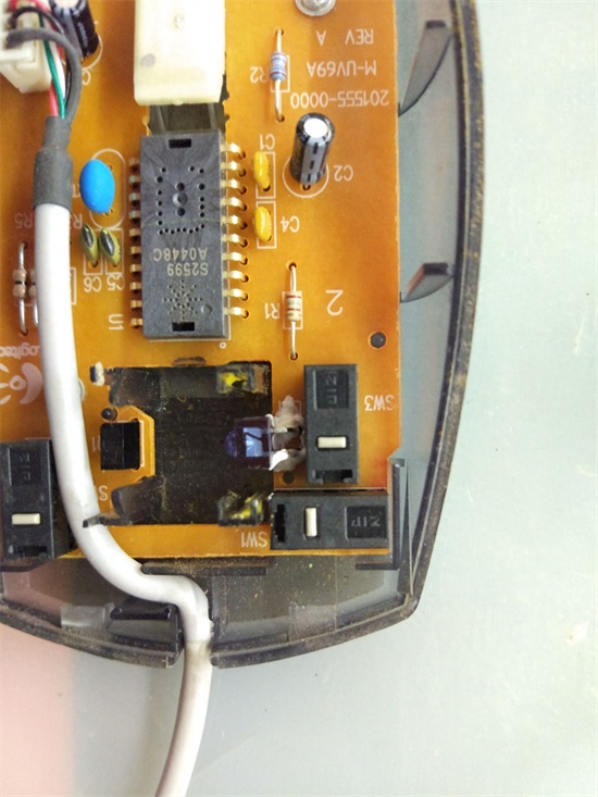 光栅被放在滚轮中间,罗技真心不错,这么古老的鼠标,竟然做的一点毛刺没有,塑料件都特别精致,大厂真是不一样。