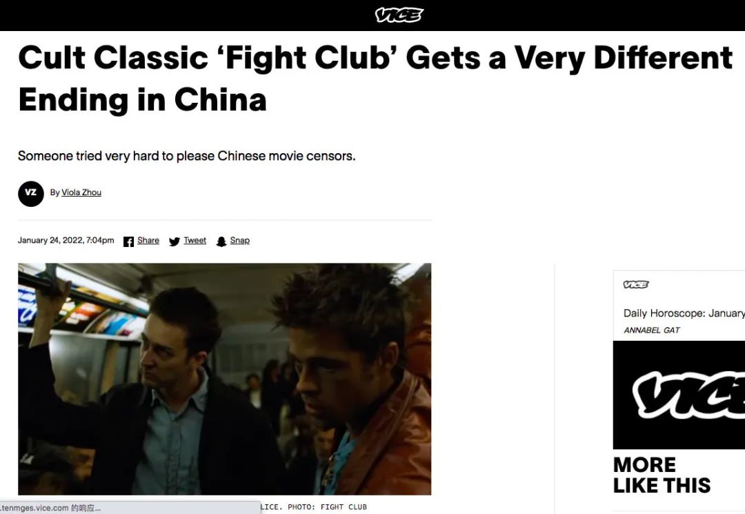 “Vice”、“综艺”等媒体都报道了《搏击俱乐部》在中国遭到结局修改。