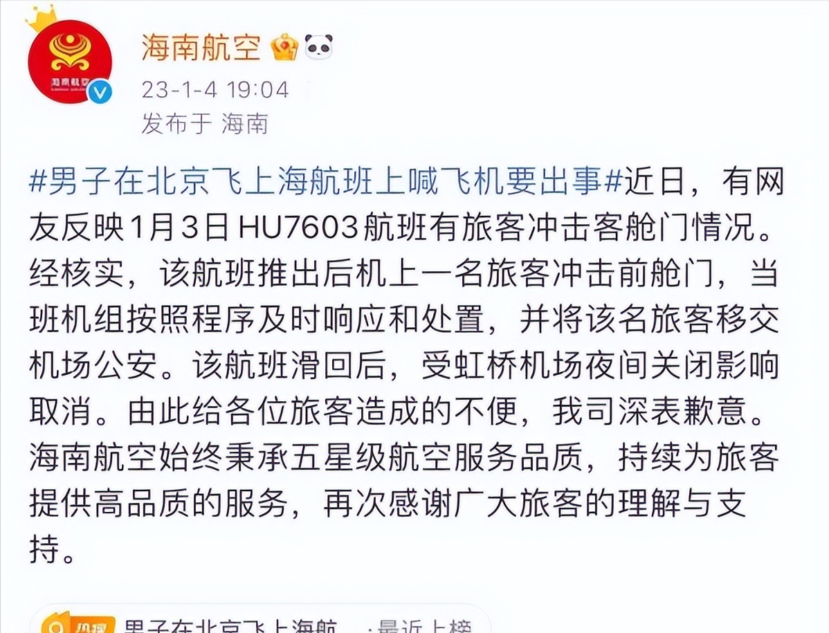 在1月3日的时候,网上一段飞机舱里面的视频在流传,只见一名男子快速的跑向前面大喊“飞机要出事了”,边喊边去想要拉开客舱门,引起很多的乘客恐慌。