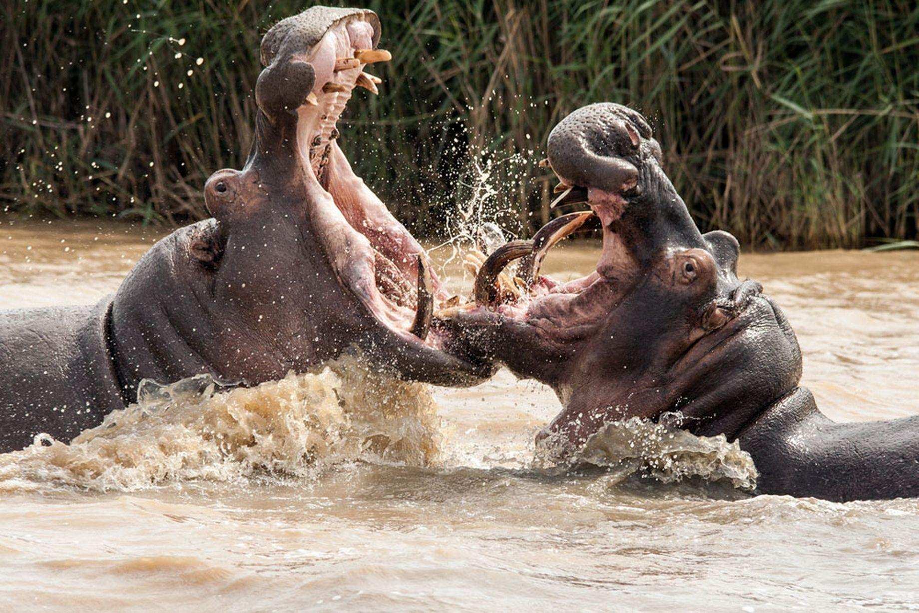 河马高达2.2吨的咬合力让它们在当地难逢敌手,再加上它们具有强烈的地盘意识,遇到误入自己领地的动物就会开打,鳄鱼就经常受到它们的误伤。