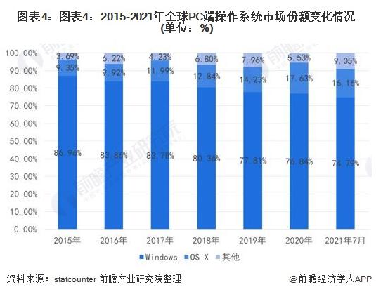 全球桌面操作系统市场主要产品包括 Windows、OS X、Linux、ChromeOS 等。根据 Statcounter 显示,截至 2021 年 7 月,全球桌面操作系统市场中,Windows 市场占有率为 74.79%,远高于其他操作系统,位居第二名的是苹果公司 OS X,其市占率为 16.16%,其他 Linux、ChromeOS 等占比约 9.05%。前瞻产业研究院预计,随着新操作系统的增加,windows 也将进一步增加其核心竞争力,扩大其市场份额。
