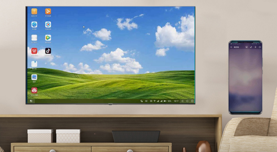 这款同屏器还支持“电脑模式”,如果你的手机支持“电脑模式”投屏的话,在我们把手机投屏到电视上以后,可以选择“电脑模式”投屏,这样一来,电视机上就会以“电脑桌面布局”的样子展示(如下图)。