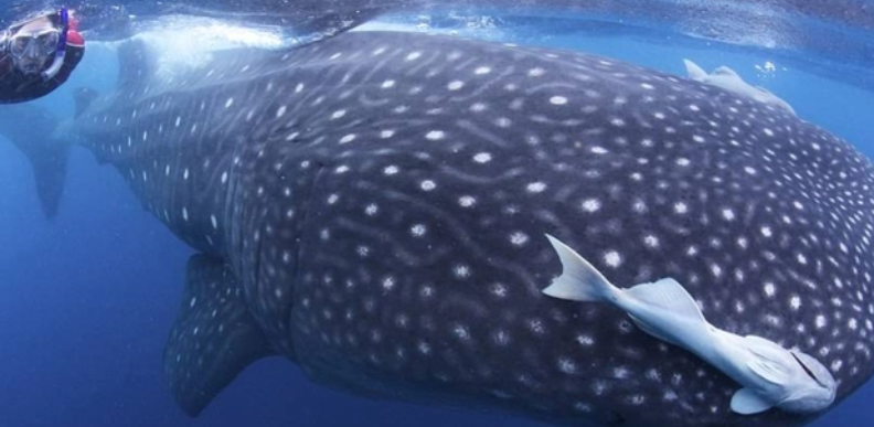 有潜水员曾做过这样一个实验:穿好所有的潜水装备,地面上的人员打配合观察鲸鲨的状况。