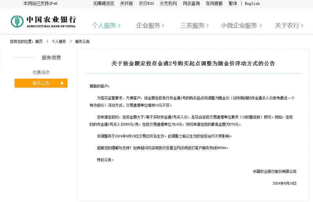 9 月 26 日,中国银行在官网发布公告称,该行将于 2024 年 9 月 27 日起调整积存金产品的购买条件。