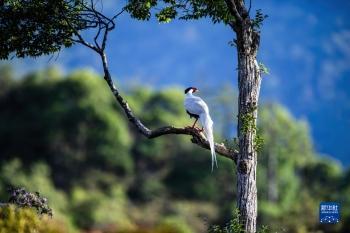 5月18日,一只白鹇在福建省永安市青水畲族乡丰田村一山坡的树枝上停歇。新华社记者 彭张青摄