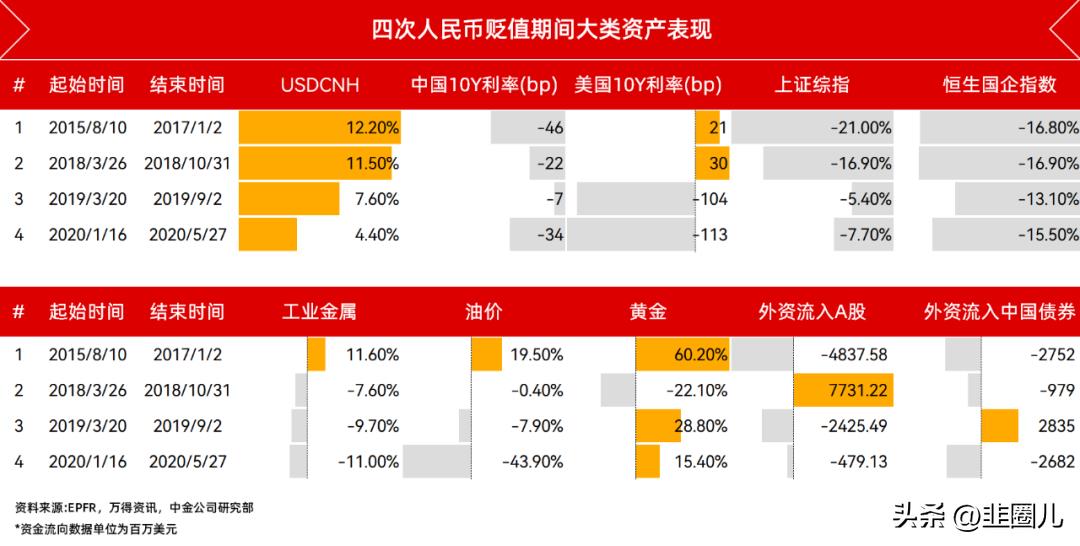 之前中金整理过往4次人民币贬值期间大类资产表现情况: