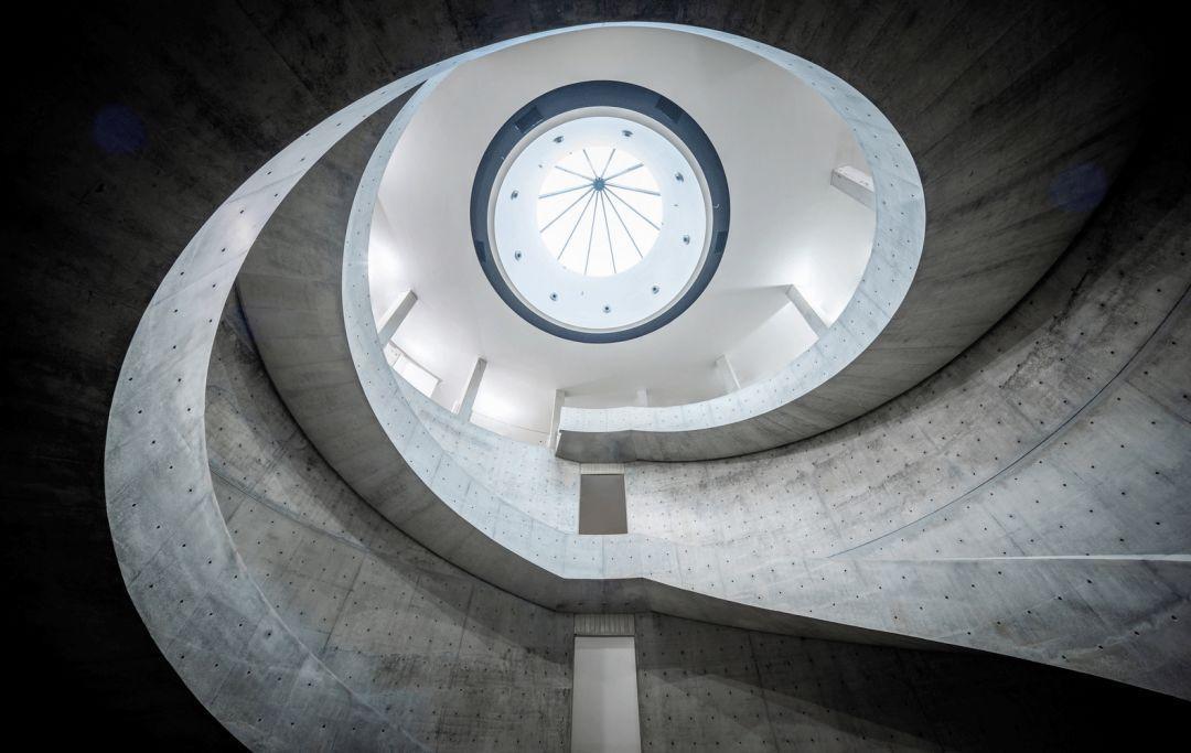 光,从建筑中心的“天井”流入展览空间,充溢于中庭,将其中的双螺旋楼梯带入眼帘,以此重新诠释当代中国传统建筑原理。安藤先生从岭南传统的水边小宅中汲取灵感,将展览区域设计为圆形空间。