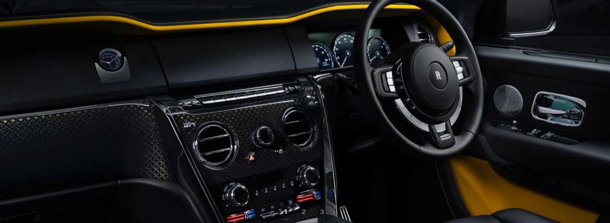 库里南Black Badge内饰,3D碳纤维内饰及中控延伸至车门的黄色线条,双座设计,一切为年轻新贵打造
