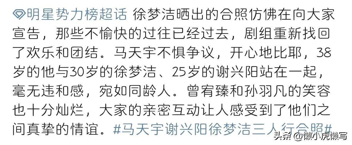 随后,“马天宇谢兴阳徐梦洁三人行合照”冲上了微博热搜。