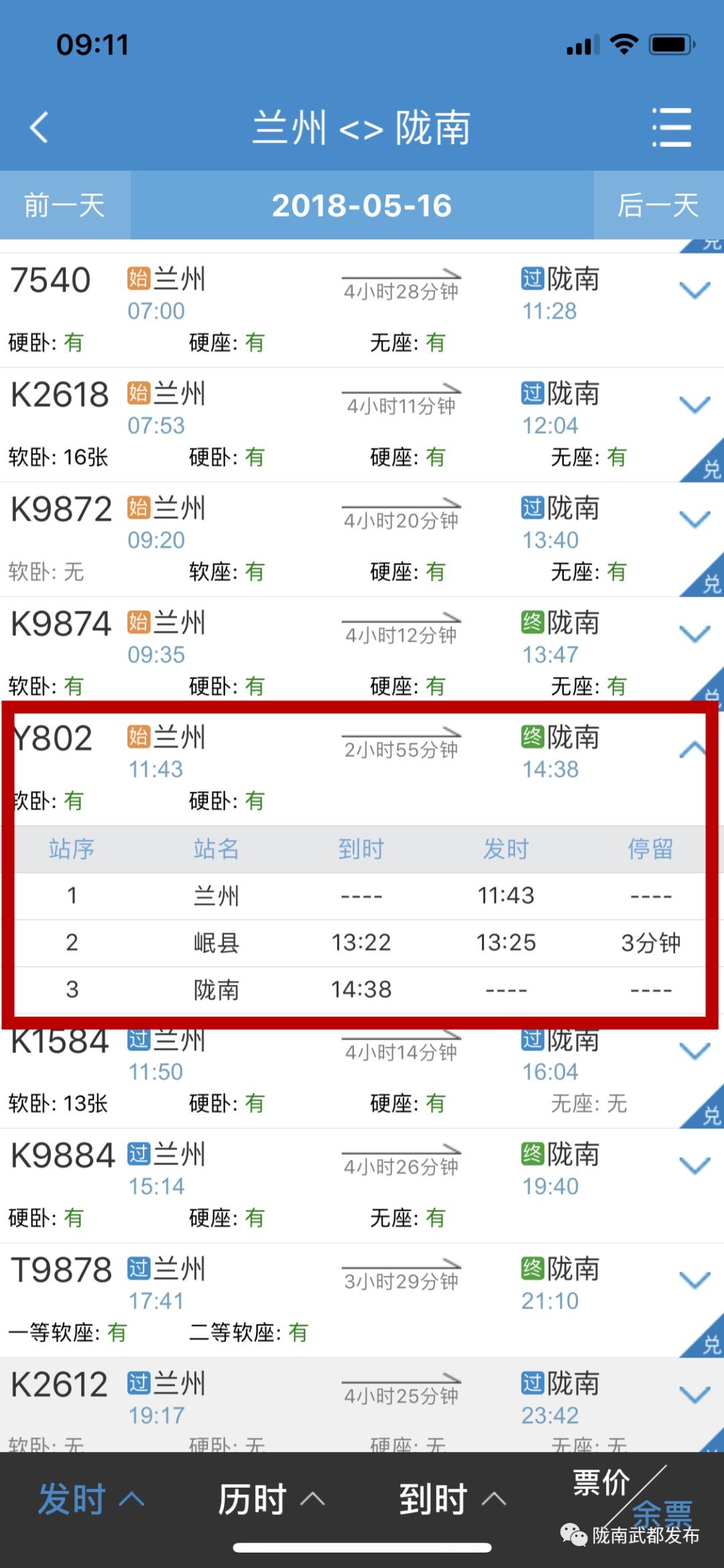 其中,兰州至陇南Y802次列车,兰州站始发时间为11∶43,到达陇南站时间为14∶38,沿途只停靠岷县站3分钟;陇南至兰州Y801次列车,陇南站始发时间18∶00,到达兰州时间为20∶56,沿途仅停靠岷县站4分钟。