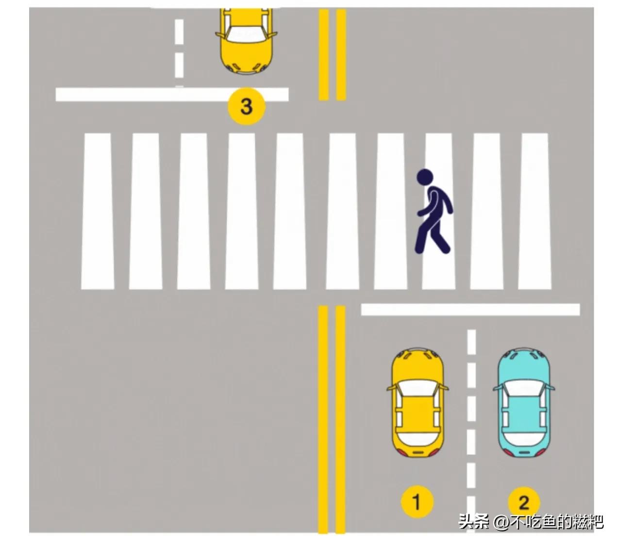 还有一种情况:道路中央是双黄线或隔离栏,行人开始通过斑马线时,行人所在车道车辆和下一车道车辆必须让行。比如下图情况:2车道可通行,1、3车道需要让行。