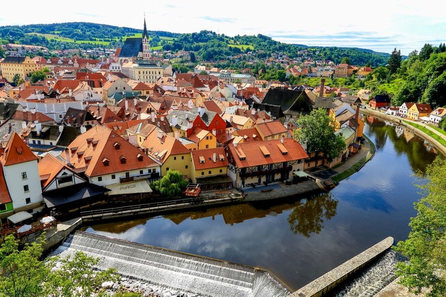 也是十分著名的童话小镇。这里大部分的建筑采用哥德式和巴洛克式风格。从高空俯瞰,一片橙色、黄色的砖顶在眼前,倍感温馨。蓝天白云下的小镇、河流、高塔、山丘交织成一幅明信片无法比拟的、一道美丽的风景线。