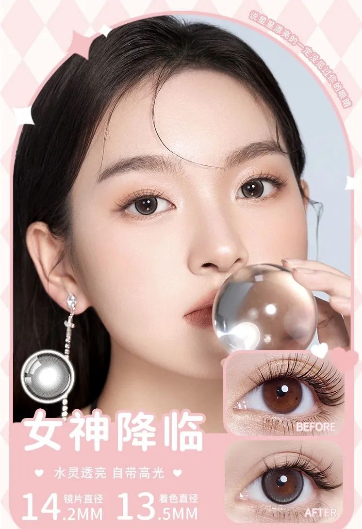 经典款「女神降临」让人眼含水波,泛着清冷女神的点点易碎感!14.2mm的镜片半径、13.5mm的着色半径打造出如黑色玻璃珠般剔透的瞳孔,让双眼自带水光,氛围感自动拉满!