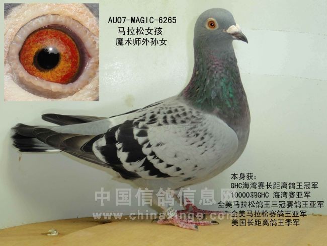 AU 2006 MAGIC 5154 获天柏市联赛2278羽142鸽舍冠军 AU 2005 MAGIC 4143 获天柏市联赛2473羽140鸽舍冠军 AU 2005 MAGIC 4155 获 天柏市联赛2102羽126鸽舍冠军 AU 2003 MAGIC 2066 或 500英里天柏市联赛1117羽91鸽舍参赛的冠军 AU 2008 MAGIC 7667 获 2008年GHC 海湾经典赛全距离多关综合3名 AU 2009 MAGIC 8176 获天柏市600英里当日伯马冠军 同时还获得海湾经典赛指定鸽冠军