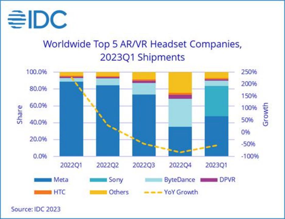 据 IDC 公布的最新报告显示, 2023 年第一季度,全球增强现实(AR)和虚拟现实 (VR) 头显出货量同比下降 54.4%,其中 VR 头显占比为 96.2%。市场低迷,出货量行情表现欠佳,这是行业整体不得不面对的事实。而作为进入元宇宙大门的第一把钥匙,面对着落地场景和商业故事的缺失,头显市场还能继续玩下去吗?未来将会以什么样的情况发展?