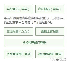 编者语:有些小伙伴看到这么多的菜单就有些懵了,其实不用紧张,如果你是第一次来的男生,直接从“兵役登记(男兵)”进入页面就可以了;否则就从“应征报名(男兵)”进入页面;如果想报名直招士官,就从“直招士官报名”进入页面,不过,今年的士官直招貌似还没开始 -_-!!
